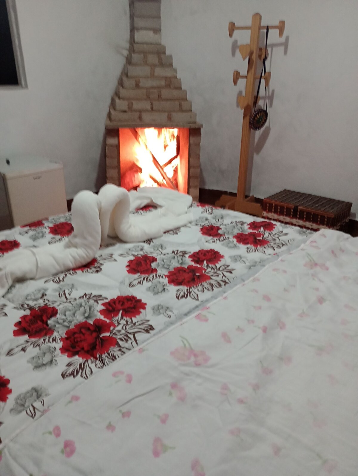 Charmosa e confortável suíte, conta com uma maravilhosa "casa de banho" (banheiro). Ampla suíte, aconchegante e única! Conta com todos os itens para o conforto dos nossos hóspedes, como macia cama king size, mesinha com cadeiras, cômoda, armário, tapetes, smart tv 40 giratória, decoração especial. O banheiro é um caso à parte, enorme e muito charmoso!