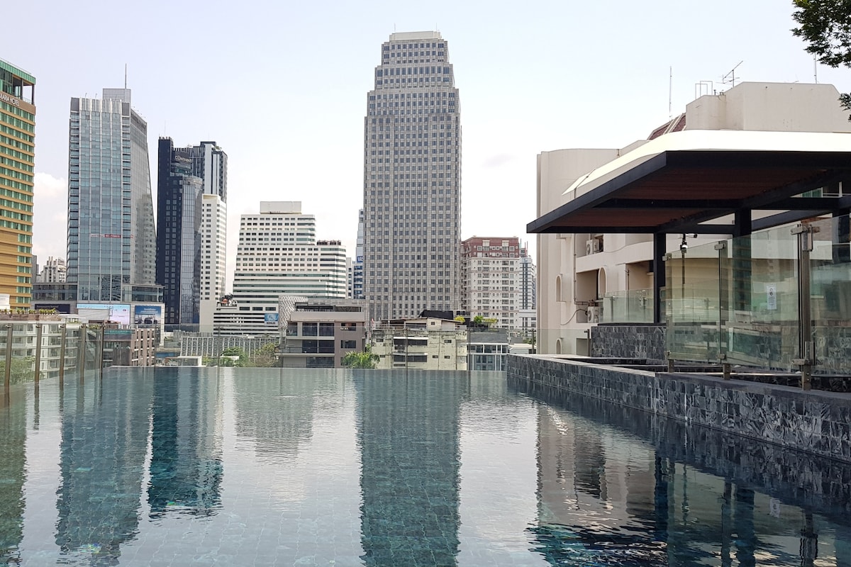 Estudio B1D en el centro de la ciudad/cerca del metro/vistas de la ciudad desde lo alto/área comercial de Siam/recogida gratuita/piscina al aire libre/gimnasio/bar en la azotea/recogida y traslado al aeropuerto durante cuatro noches
