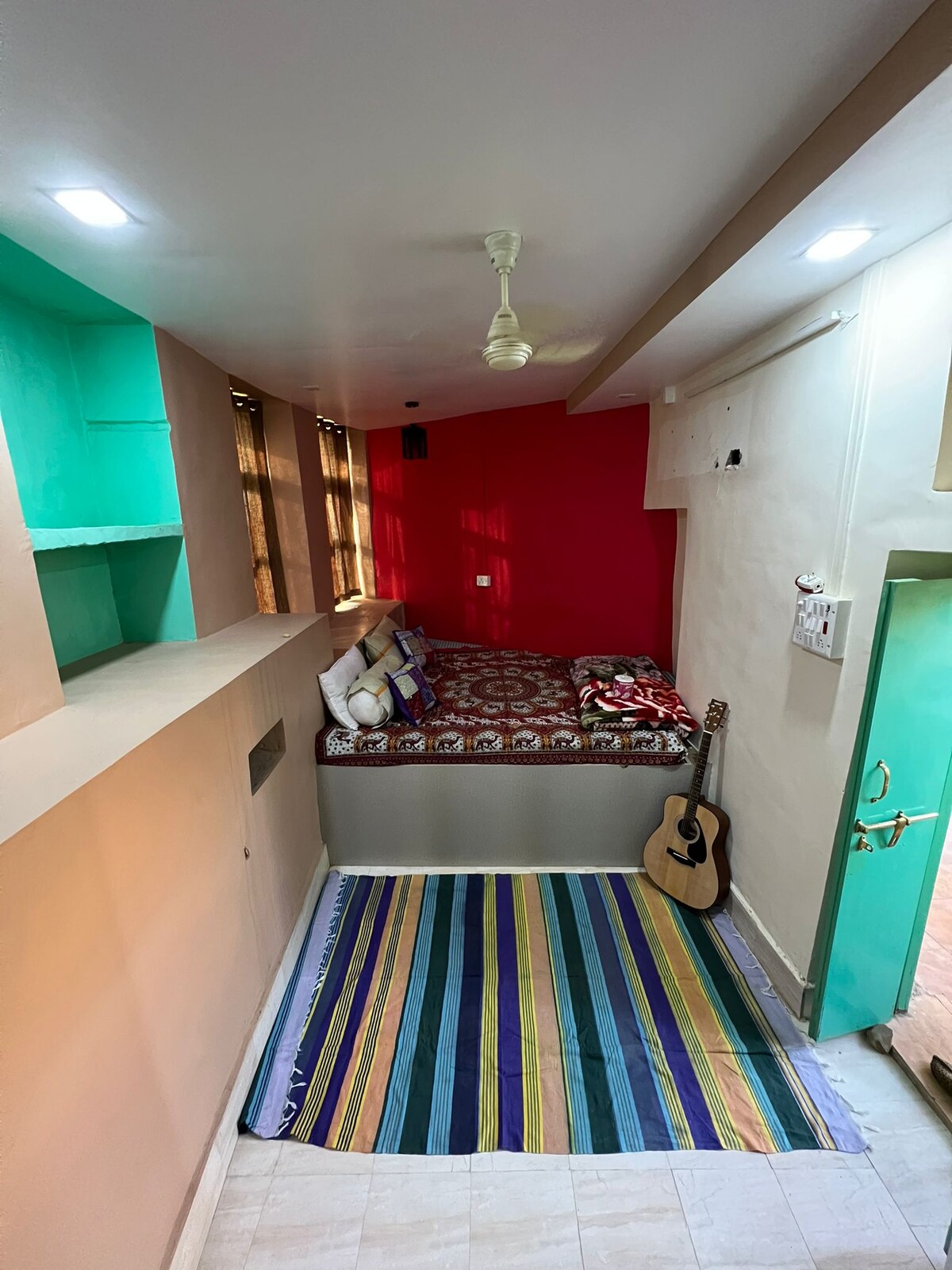 Disfruta de una cómoda habitación privada con aire acondicionado y una encantadora ventana con vistas a la calle, perfecta para ver pasar la colorida vida de Jaisalmer. Esta habitación ofrece comodidad y una sensación de conexión con la Ciudad Dorada al aire libre. Características principales Aire acondicionado para un sueño fresco y reparador Ventana con vista a la calle con abundante luz natural Cama doble con sábanas limpias y limpias Baño privado adjunto con agua fría y caliente Muebles minimalistas para una estancia acogedora y ordenada