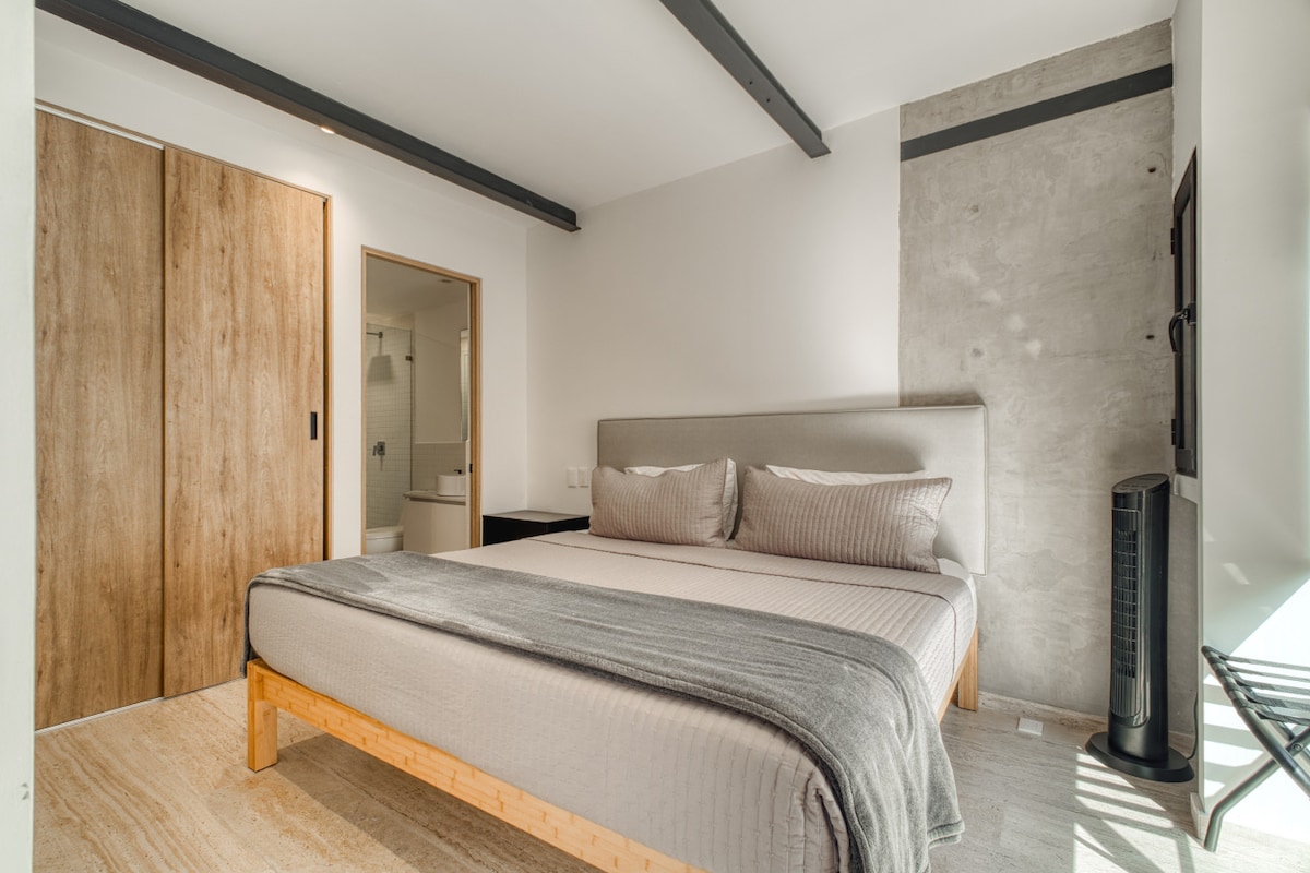 Our modern studio apartments by VIATO HOMES in Nomad Living are designed to maximize comfort and functionality in an open, contemporary layout. Each unit features a cozy sleeping area, full bathroom, compact fully equipped kitchen, and a stylish living space that’s perfect for business travelers, couples, or solo guests. Guests also enjoy access to building amenities including the gym, pool, coworking hub, and BBQ area, all within a secure building with 24/7 concierge and parking availability.
