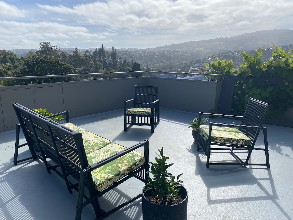 Apartamento estudio independiente con vistas panorámicas al mar. Espacio fresco y moderno que se adapta a tu necesidad de una estancia relajante. Wifi gratuito, Netflix, TV, baño, jardín nativo con tui y pájaros campanarios en la puerta. Cocina americana. Se proporcionan toallas y ropa de cama. Situado en Dunedin, a 8 minutos a pie de la playa de St Clair, piscina de agua salada, cafeterías y restaurantes. A 7 minutos en coche del centro de negocios y a 10 minutos en coche del estadio Forsyth Barr. Aparcamiento gratuito en la calle.