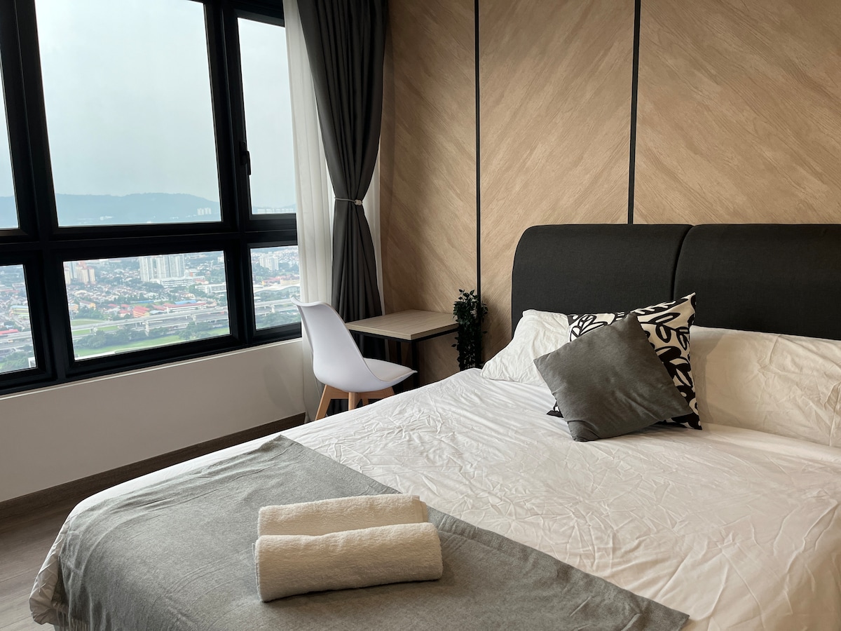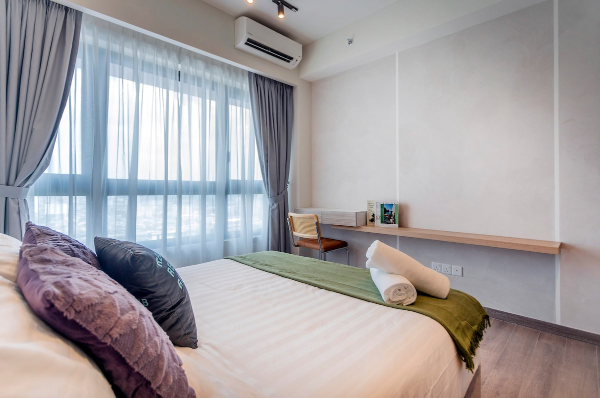 Este apartamento de 1 dormitorio cuenta con una vista impresionante del horizonte de KL. Cuenta con un salón con sofá de 3 plazas, mesa de comedor, cocina, escritorio y un gran balcón frente a la Torre KL y las Torres Petronas. Viene con TV de 55 pulgadas, wifi de alta velocidad y una cama tamaño queen en la que puedes acomodarte cómodamente. *La otra unidad de este apartamento de llave doble es un estudio compacto con cama tamaño queen, despensa, baño y bañera. Pueden caber amigos que viajan contigo con privacidad. ¡Te invitamos a solicitar más información!