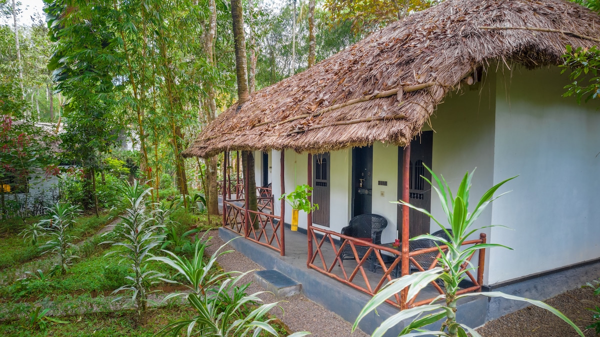 Un simple remedio para el calor y la humedad de las llanuras de Kerala es un viaje a las montañas de Thekkady. Shalimar Spice Garden Resort es uno de los mejores resorts de Thekkady, ubicado a una altura de 800 metros en el borde de la Reserva de Tigres Periyar. El aire aquí es relativamente fresco y la vida es simple. Las casas de campo cubiertas de paja se encuentran en medio de plantaciones de especias verdes brillantes que están rodeadas de árboles cargados de mangos, nuez moscada y cardamomo.