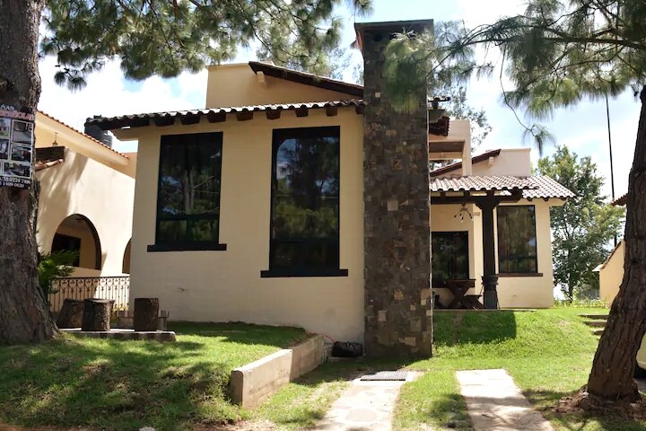Disfruta de una cabaña en el bosque totalmente equipada para que tu experiencia sea inolvidable. Consigue un descanso de lujo en sus colchones de calidad, diviértete en su terraza con asador y estufa, ten una noche romántica en su terraza con chimenea. Deja que tus hijos corran y rían en la explanada jugando en la casita infantil y quemen bombones en su fogata. Ubicada dentro de la seguridad del fraccionamiento Los Cazos con acceso a La Cascada El Salto.