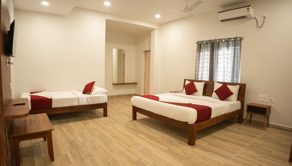 A premium 3-star hotel nestled in a peaceful temple town, thoughtfully designed to offer comfort, elegance, and tranquility. The hotel features tastefully furnished rooms with modern amenities including high-speed Wi-Fi, air conditioning, smart TV, and well-appointed bathrooms. With a pure vegetarian dining option, ample parking and 24-hour front desk, the hotel is ideal for pilgrims seeking a refined stay without compromising on serenity and value.
