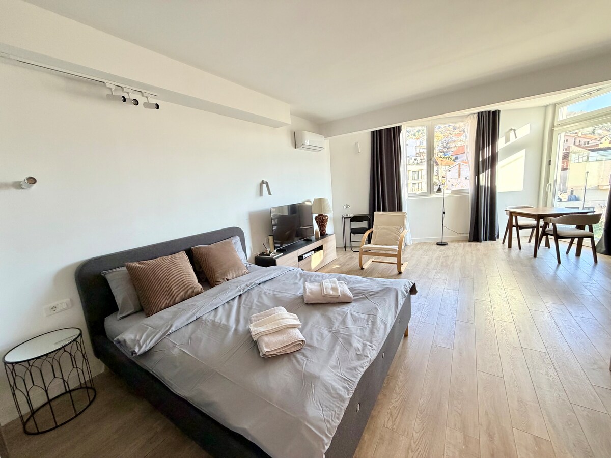 Relájate en un moderno apartamento de 1 dormitorio en Mazina, Tivat, a solo 15 minutos a pie del mar y de Porto Montenegro. Disfruta de hermosas vistas al mar, piscina compartida, sauna y estacionamiento privado en garaje. El departamento de 36 m² cuenta con una cocina totalmente equipada, aire acondicionado e Internet de alta velocidad. Ideal para parejas, viajeros solitarios o trabajadores remotos que buscan comodidad, conveniencia y un toque de lujo costero.