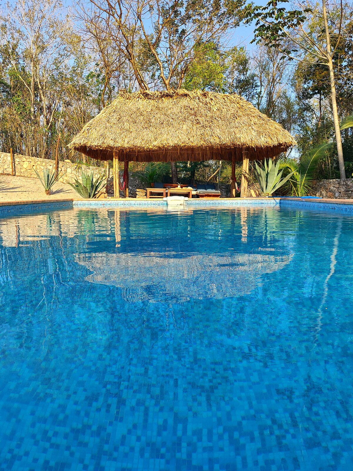 ¡Una deliciosa palapa para 4 personas al lado de una hermosa piscina en el corazón de la selva! ¡Un paraíso en la tierra acunado por el canto de los pájaros exóticos sentirás paz y bienestar! Un verdadero sueño. Acceso a la palapa relax 🌿con sus masajes terapéuticos y también el eco lodge dispone de un restaurante con especialidades locales y también cocina francesa , de dulces sabores , con reserva y a precios muy accesibles.