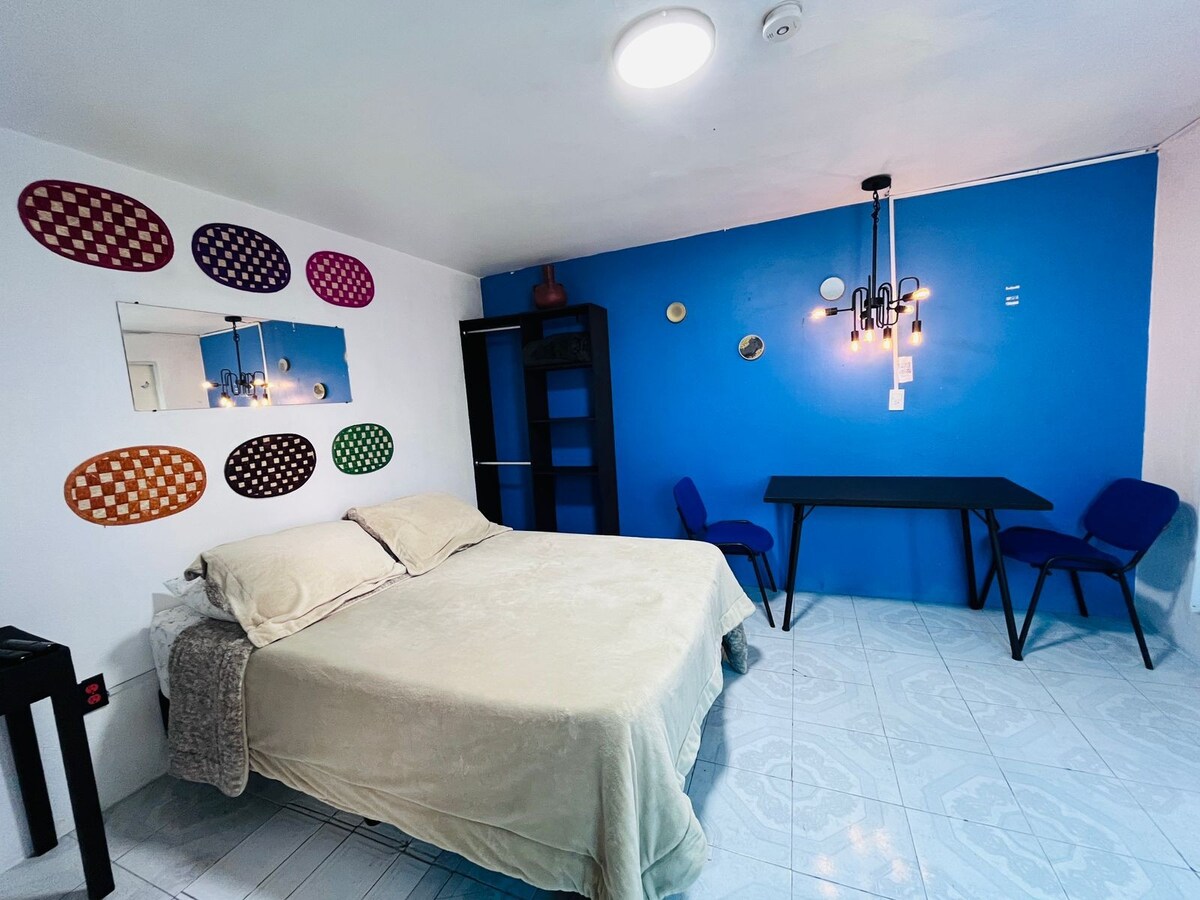 El alojamiento es un departamento independiente de la casa principal, con acceso propio. Cuenta con una habitación (2 personas, cama matrimonial); 1 estudio (con desayunador, escritorio, sillas y libreros); cocineta (sin estufa, solo con una hornilla eléctrica); baño completo; y 1 lugar de estacionamiento. Ubicada en la zona sur de la Ciudad de México, a 5 minutos del Museo Dolores Olmedo y del tren ligero la Noria, a 10 min de las famosas trajineras y el mercado de flores.