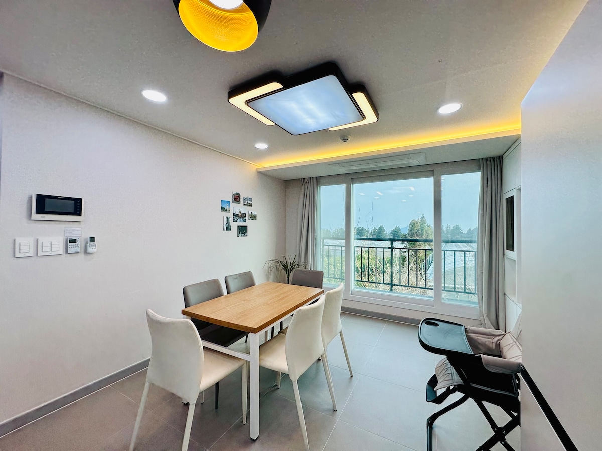 En el pueblo más cálido y tranquilo de Seogwipo, hay una villa donde no solo los adultos, sino también los niños y los ancianos pueden disfrutar. Tenemos un jacuzzi, parque infantil, invernadero, zona de pícnic, etc. Es una villa llena de bonitas zonas fotográficas. Los pisos están separados y tienen cocinas individuales y salas de estar, por lo que es perfecto para viajar con familias numerosas o parejas con niños. Artículos para bebés proporcionados: esterilizador UV, detergente para biberones, hervidor de fórmula, silla alta, bañera, cuna y asiento de inodoro