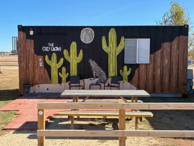 EC can sleep 4 comfortably. There is a queen size bed as well as a queen size pull out couch. The kitchenette is equipped with a keurig coffee maker, toaster, electric kettle, microwave and refrigerator. The bathroom has several extras in case you forget something. The shower, which has exposed copper plumbing, is sure to impress. Outside there is a small patio with adirondack chairs that over looks the horse pasture and our beautiful Panhandle sunsets.