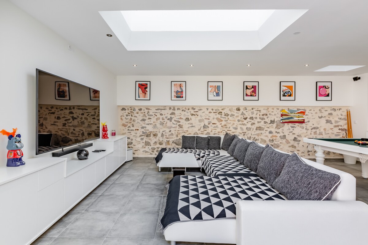 Superbe Loft Moderne 2 Chambres Découvrez ce loft contemporain de standing, rénové avec soin et offrant un style unique mêlant design moderne, pierre apparente et grands volumes baignés de lumière. Magnifique billard intégré à l’espace séjour, idéal pour des moments conviviaux. Salon confortable avec TV grand écran. Cuisine moderne entièrement équipée Accès direct à la terrasse grâce aux baies vitrées coulissantes. Deux chambres confortables