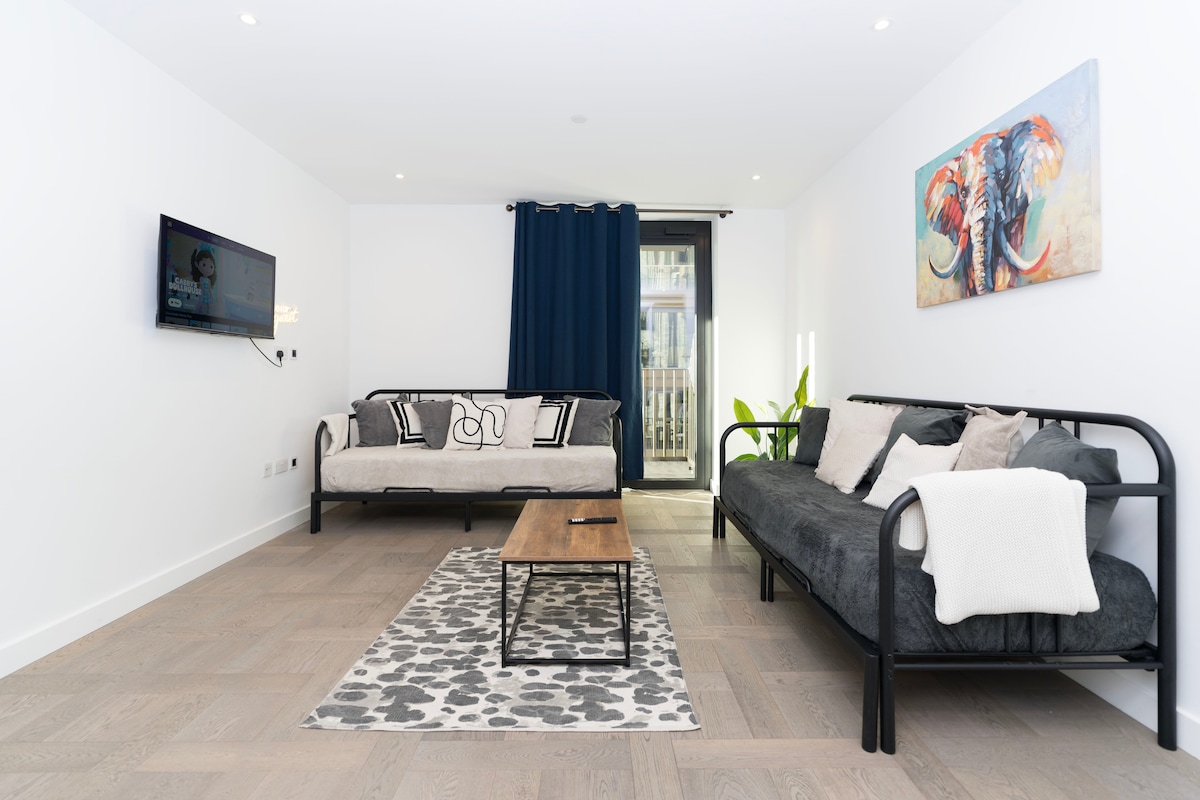 Nuestro departamento de 1 dormitorio con aire acondicionado es perfecto para dos. Encuentra una acogedora sala de estar, un dormitorio con una gran cama tamaño queen y ventilador HEPA, baño con artículos de tocador de alta gama, una elegante cocina equipada y una gran terraza muy verde solo para que disfrutes después de explorar Londres. Cerca de 4 estaciones de metro, todas a menos de 10 minutos a pie. Experimenta Londres desde lugares de interés de fama mundial, barrios emocionantes, hasta acogedores pubs junto al río, ¡siempre es un buen momento para visitarlo!