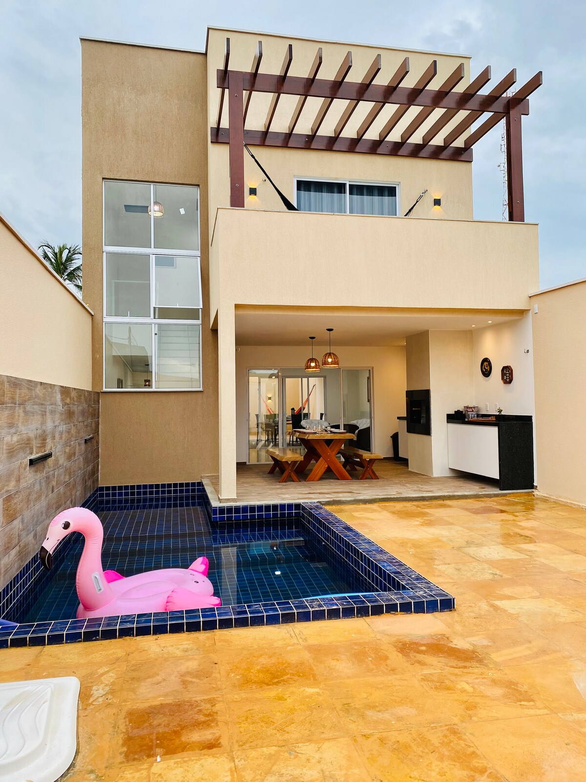 Relájate con toda la familia en este alojamiento tranquilo. Cuenta con 4 dormitorios, 2 de ellos suites (todos con aire acondicionado), cocina equipada, sala de estar con TV, wifi, piscina y terraza con barbacoa. Situado en la playa de Guajiru, en la calle principal, a 500 metros de la playa. Cerca de las playas de Flecheiras y Mundau. Cerca de tiendas, restaurantes y farmacia.