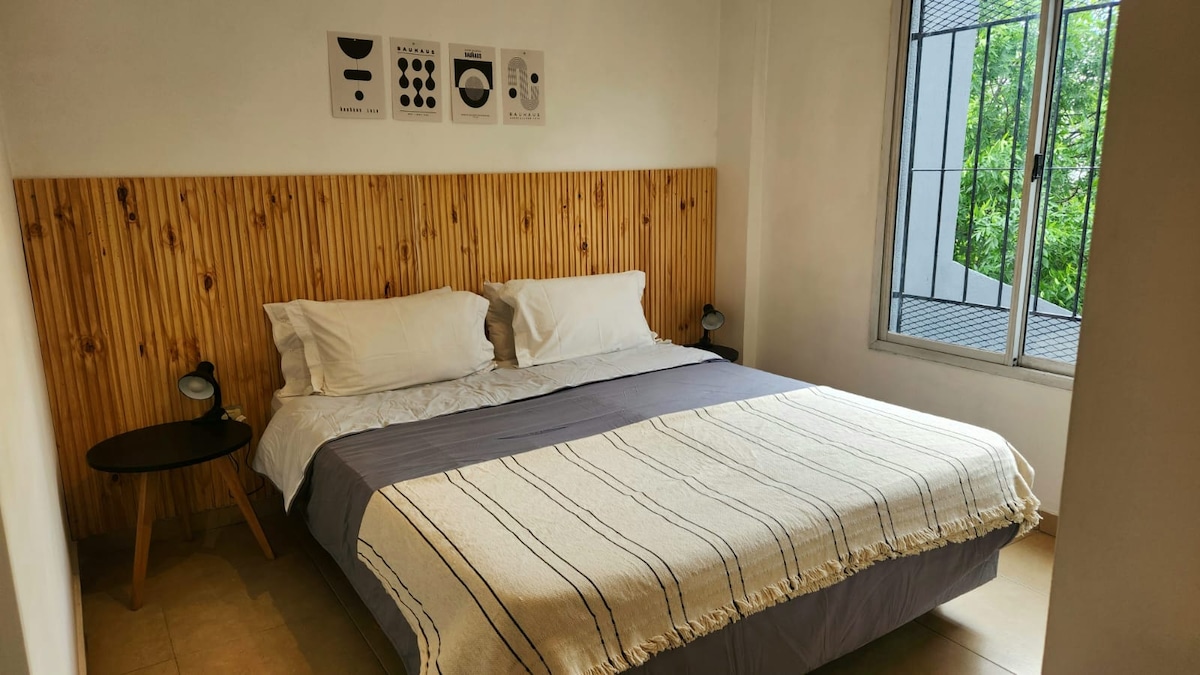 Luminoso monoambiente donde el cálido atardecer escapa por la ventana. PROMOCION NAVIDAD Y FIN DE AÑO RESERVA 5 DIAS Descansa en este tranquilo y hermoso departamento. Sábanas y toallas calidad hotelera, amenities. Equipado con electrodomésticos, aire acondicionado, TV con cable y wifi, secador de pelo. A una cuadra del área de servicios con restaurantes, cafeterías, panadería p/ celiacos y veganos y transporte público.