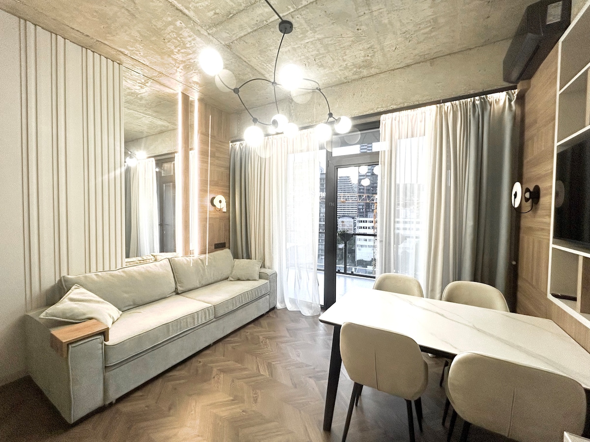 Te damos la bienvenida a un alojamiento tranquilo y ecológico. Es un estudio elegante de nueva construcción. El edificio de apartamentos está situado frente al barrio más conocido de Tiflis "Jikia House". Nuestros huéspedes pueden utilizar los servicios de Jikia House, ya que también tenemos otros departamentos allí. Cerca de la casa, hay algunas universidades, espacios de trabajo conjunto, restaurantes, mercados, líneas de transporte bien conectadas al centro y una estación de metro de la Universidad Estatal.