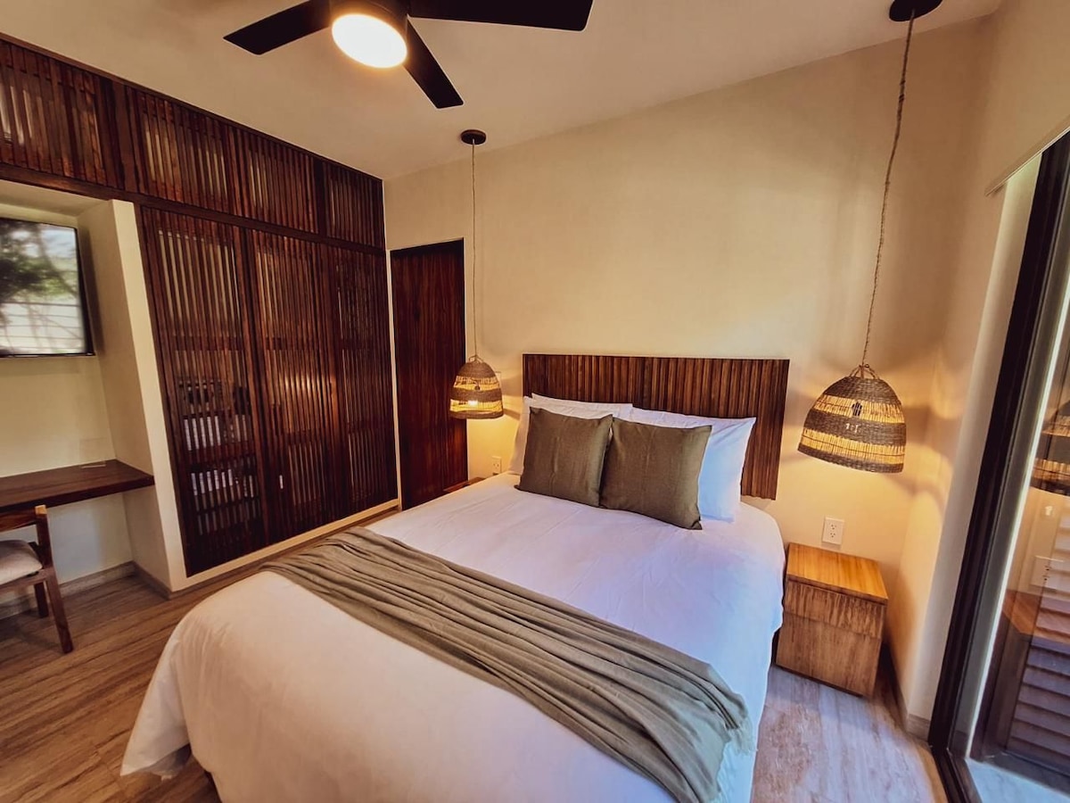 Centro vacacional de alta gama con un apartamento privado y bien mantenido: tu oasis privado con comodidades de hotel y conserje personal. Enorme patio privado al aire libre, interior bellamente decorado con arte de fabricación local. Disfruta de una cama tamaño king, agua potable purificada, ventanas de vidrio del piso al techo, cocina completa, sofá plegable, aire acondicionado, wifi, lavadora/secadora + amplio espacio en el armario. Fantástica comunidad con 2 piscinas, el gimnasio más grande de Tulum, seguridad las 24 horas, restaurantes en el lugar, panadería y supermercado y transporte gratuito a la playa.