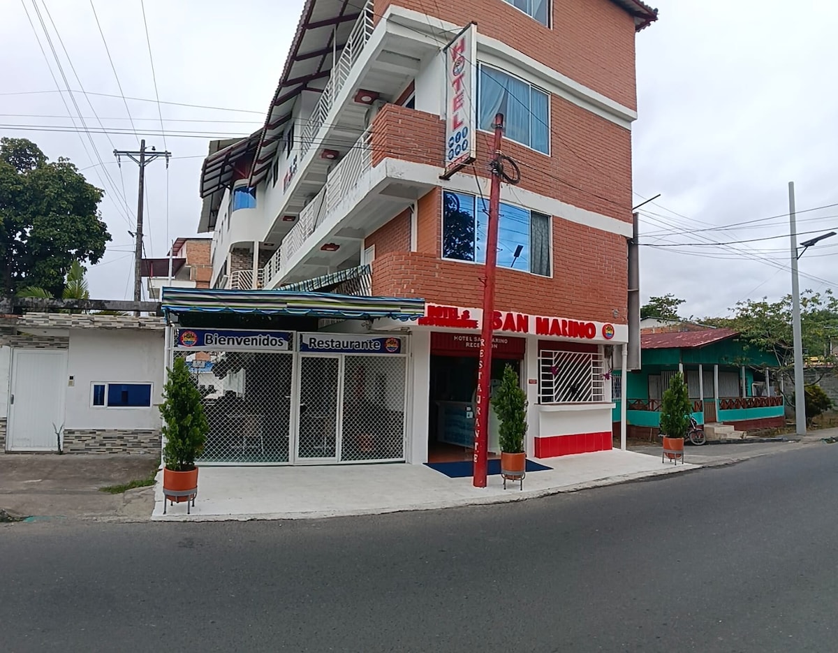 Bienvenido a Hotel San Marino, un espacio acogedor y cómodo ubicado a pocos pasos de la playa del Morro en San Andrés de Tumaco. Aquí encontrarás el equilibrio perfecto entre descanso, comodidad y atención personalizada. Nuestro hotel está diseñado para que disfrutes una estadía tranquila, ya sea en pareja, en familia o con amigos. Contamos con habitaciones limpias y confortables, piscina, parqueadero y atención 24/7, siempre dispuestos a brindarte una experiencia agradable y segura.
