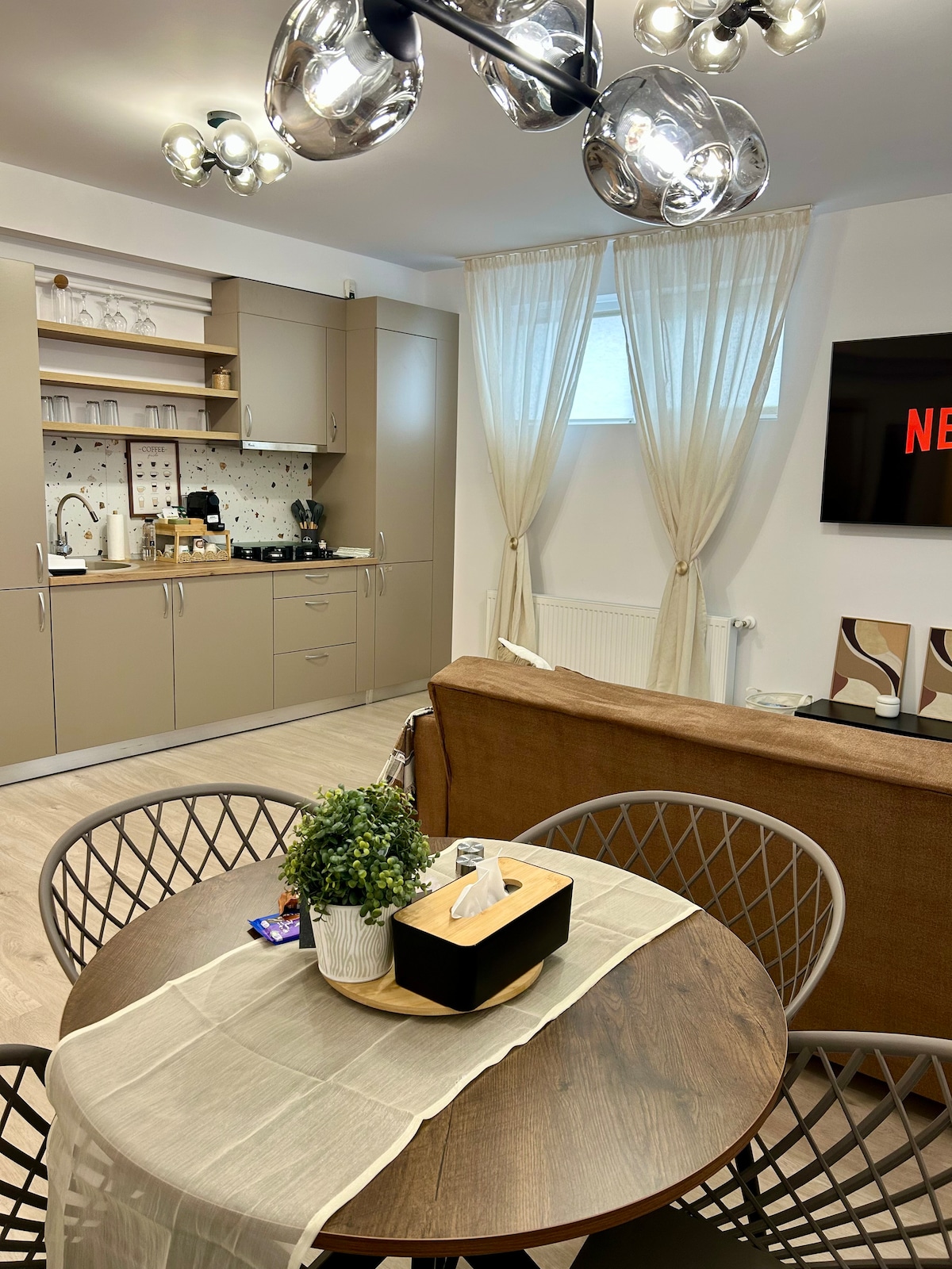 Welcome to Antonia's Cozy Studio apartment in the heart of Cosmopolis - the perfect spot for both leisure and business travelers. This modern home features an open-plan living area with a fully-equipped kitchen, including a coffee maker. Its living room area has a flat-screen smart TV, high-speed Wi-Fi, and an expandable couch for comfort. Step outside to the apartment's charming terrace, an added bonus where you can enjoy a morning coffee or unwind in the evening with a glass of wine.