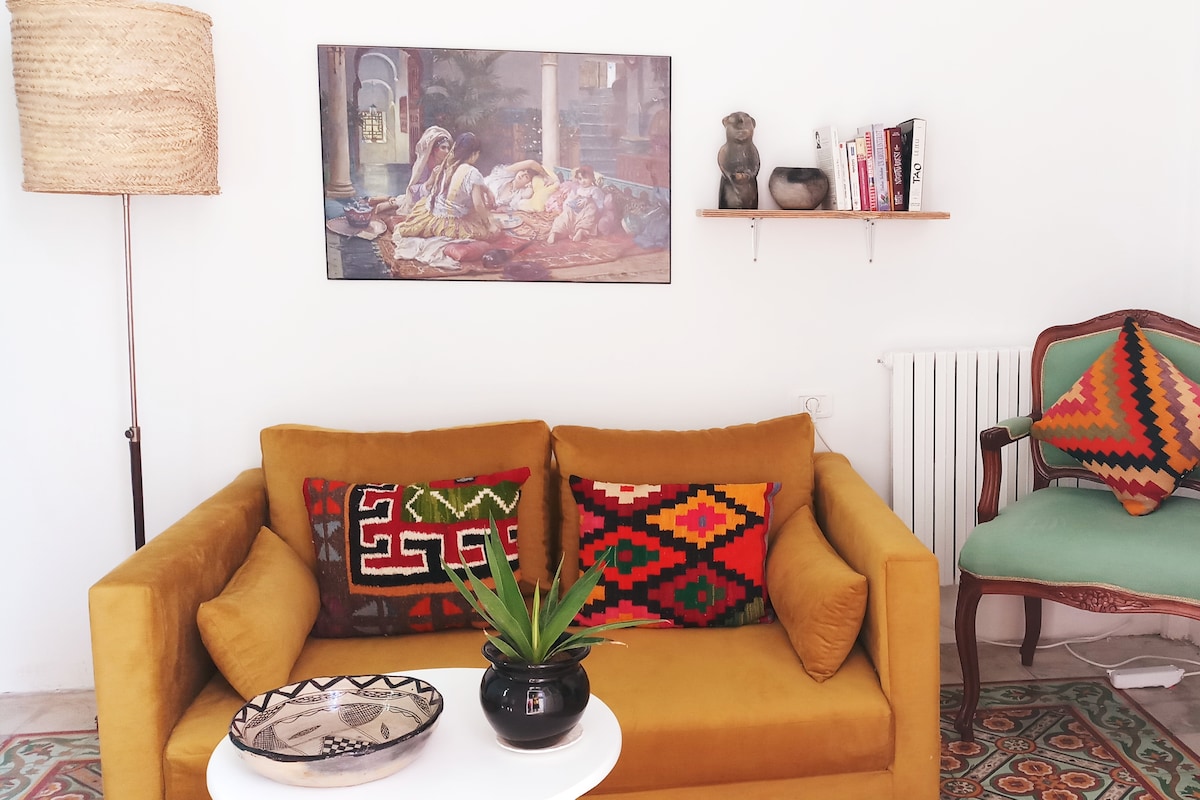 un encantador estudio con una decoración típica idealmente situado en uno de los barrios más seguros en el corazón del parque arqueológico de Cartago. dispone de una entrada independiente, que consta de una sala de estar, pequeña cocina, dormitorio, baño con bañera, situado al lado de todos los servicios cafeterías, restaurantes, tiendas de comestibles, supermercado, tren,... playa 100 m, puerto púnico a 200 m, teatro romano a 200 m, cerca de museos y monumentos históricos a 1,5 km de Sidi Bou Said.