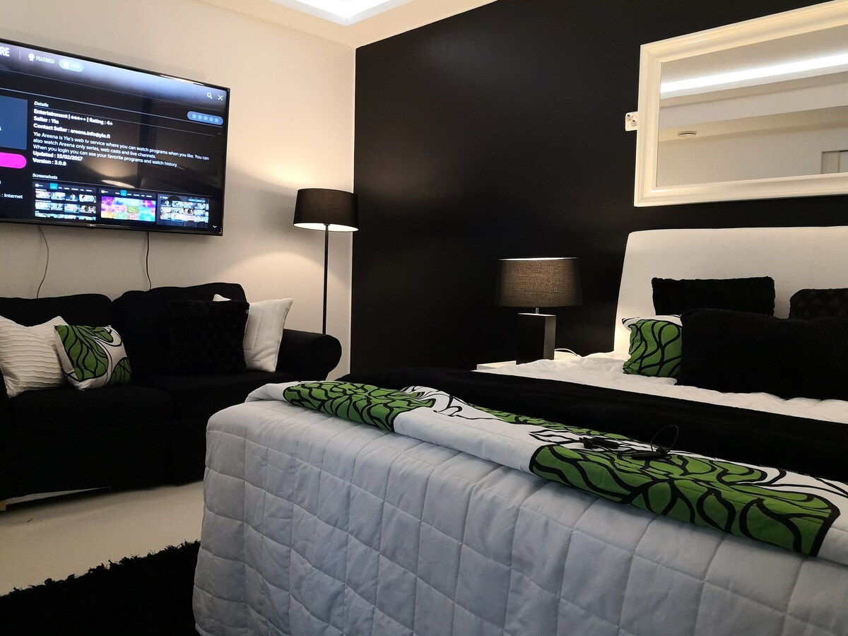 Ainutlaatuinen, maalämpötalossa sijaitseva kaunis condo-huoneisto, jossa oma sisäänkäynti, makuuhuone, ruokailutila, sauna, suihku ja wc. 2 yötä yöpyville jacuzzi kuuluu majoitukseen 2h/pv. Muutoin vuokra on majoituksen aikana viikolla su-to 35e/2h ja pe-la 49e/2h. Sijainti uudella asutusalueella luonnon läheisyydessä nopeiden yhteyksien päässä. Laadukas Queen-size parivuode, 120 cm vuodesohva ja mahdollisuus 90 cm varavuoteeseen. Koodilukko. Maksuton pysäköinti.
