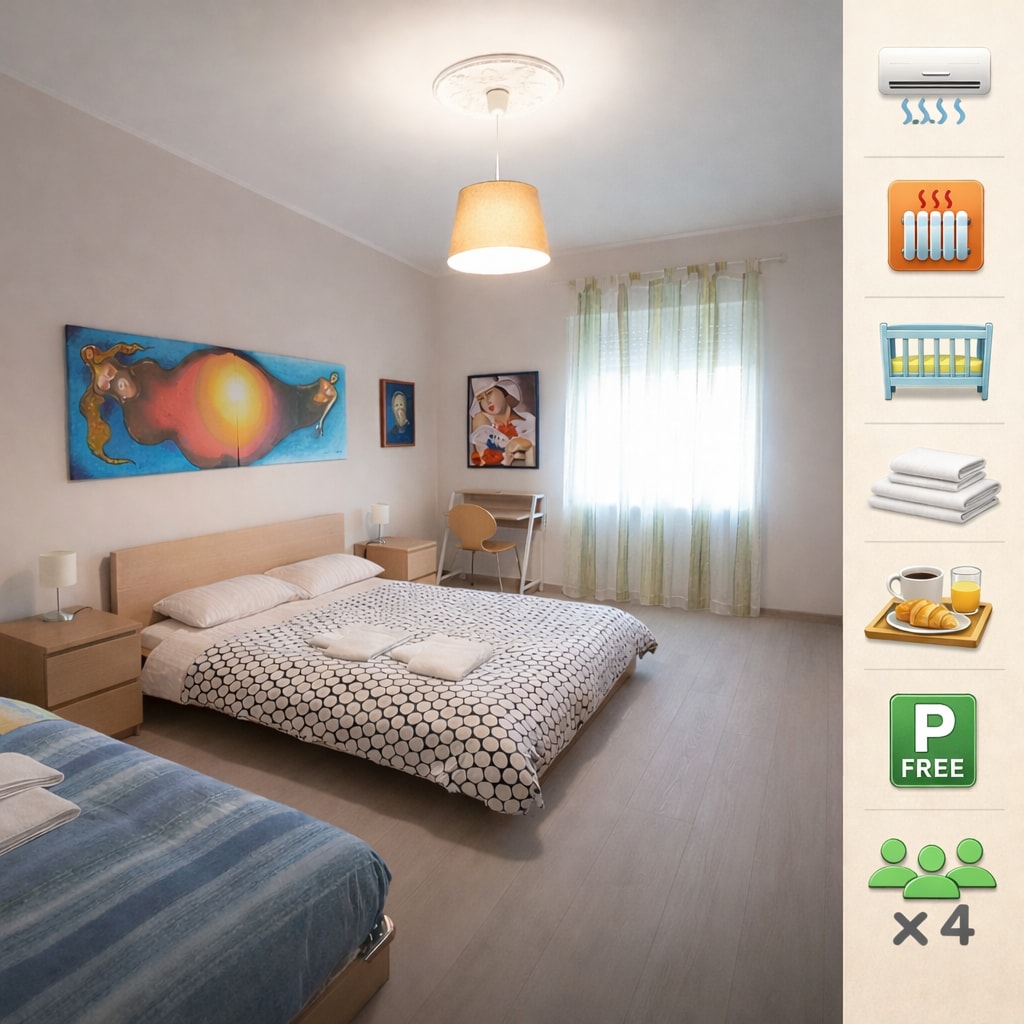 L'alloggio ospita 3 persone. Culla, seggiolone gratuiti a richiesta. Non sono possibili pernottamenti superiori a 30 notti perché io uso saltuariamente l'appartamento per uso personale. Settimo piano, vista panoramica ed ampio terrazzo: tavolo e sedie per la vostra comodità all'esterno. Wi-Fi Fibra, Tv, piano cottura ad induzione, microonde, tostapane, macchina del caffè, bollitore, lavatrice, frigo,ferro da stiro, phon. A disposizione caffè, tisane, the, Succhi di frutta.