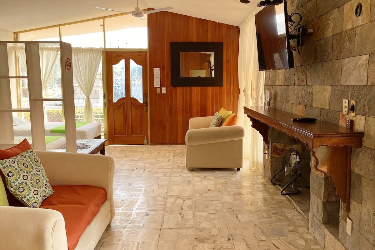 Excelente lugar para descansar, sencillo y económico, al alcance de tu bolsillo, con tres habitaciones, dos camas matrimoniales y cuatro individuales, Wifi 300 MBPS,Smart TV de 40",HBO Max, Netflix, aire acondicionado tipo mini split en las tres habitaciones, un ventilador de pared en cada habitación, dos ventiladores de pared en la sala, TV de Megacable, microondas, refrigerador, garaje para un vehículo y uno mas en la calle, Oxxo a una cuadra, Tienda 3B a una cuadra y Farmacia Similares.