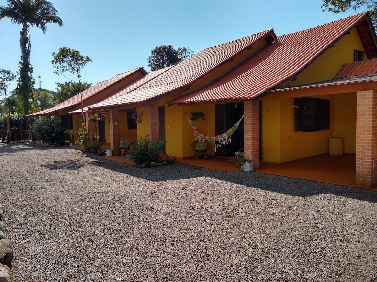 Cabaña de 1 dormitorio, que se encuentra dentro de un lugar llamado LA BASQUETERA. Pequeño río al fondo y mucha naturaleza, mucho verde y muchas flores. Laguna con peces. Pueblo de pescadores, muchos restaurantes con mariscos. Cocina completa para que el propio huésped haga sus comidas. Barbacoa privada en el balcón de la cabaña. Playa del pueblo muy tranquila.Otras playas cercanas como Itapoá,10 km y las playas de São Francisco do Sul a 20 km,después de cruzar el ferry que es un hermoso paseo por Bahía.