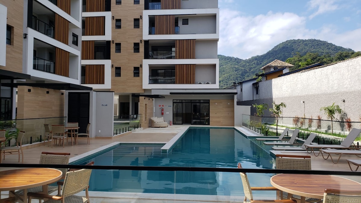 Apartamento en el condominio Reserva DNA, Praia Grande - Ubatuba. Tiene 2 baños en suite, un inodoro y un balcón gourmet con parrilla. Unidad totalmente equipada: Aire acondicionado, Wi-Fi, cocina completa y lavadora y secadora. Tiene capacidad para 6 adultos y 2 niños (hasta 5 años). Ubicado en el segundo piso. Check-in: 2:00 p. m. | Check-out: 10:00 a. m. ¡Ocio completo! (Nota: Las piscinas están cerradas por mantenimiento los martes).