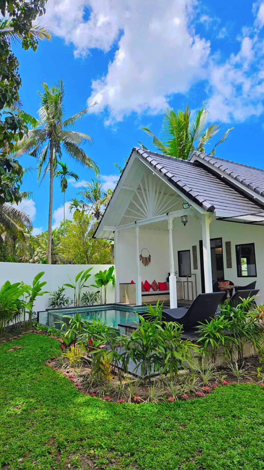 Lujosa villa privada con piscina de 6x3 metros. Segura, privada, protegida. Exuberante jardín y cocina protegida pero al aire libre para comer y relajarse junto a la piscina. Cama tamaño queen, bañera y ducha exteriores, con vistas al estanque de peces, cocina totalmente equipada. Aire acondicionado, televisión, excelente wifi, limpieza diaria y desayuno incluido. Estamos a 8 minutos a pie de la carretera principal o a un corto trayecto en scooter. Esto significa paz y tranquilidad, y sin ruido de coches. Nuestro personal estará encantado de llevarte en scooter si es necesario.