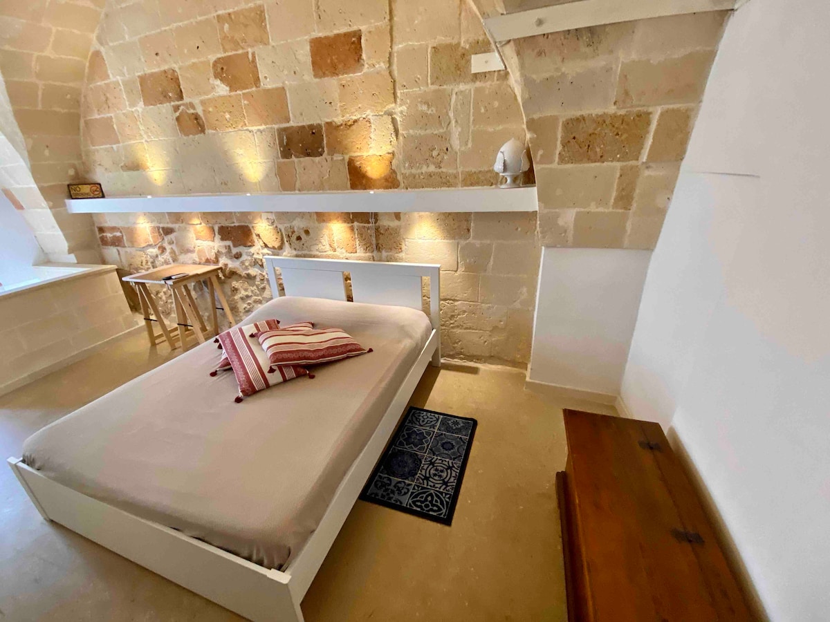 Este espacio único, tallado dentro de los trullos tradicionales, tiene su propio encanto y te permite experimentar el verdadero espíritu del valle de Itria. Entras a través de una vieja pérgola de fresa y uva. La cocina y el baño están ubicados en las alcobas, mientras que las áreas de comedor y dormitorio están ubicadas en un trullo sarraceno y un trullo de cono alto. El patio privado y la piscina infinita cercana ofrecen vistas al valle y al horizonte de Ceglie Messapica.