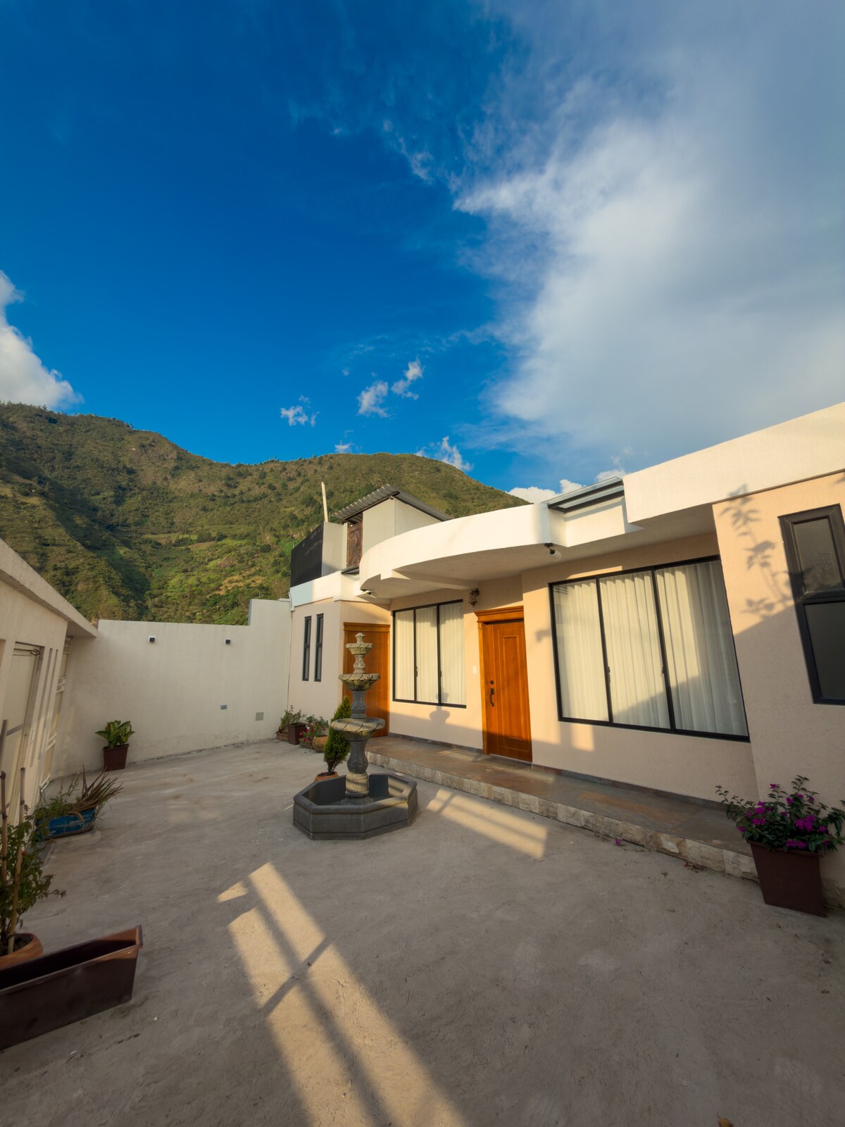 Es una casa cabaña, ubicada a 7 minutos del centro de Baños ,lleno de áreas verdes y jardines ,orquídeas y diversidad de aves , rodeada de montañas y una vista impresionante a la cuenca del rio Pastaza , única para el descanso y el relax familiar. Adicional para su conocimiento necesitan subir 38 escalones de cemento y piedra rústica , al final tendrán la recompensa de la magnífica vista al río Pastaza desde lo alto y su recién inaugurada hidropiscina de agua temperada.