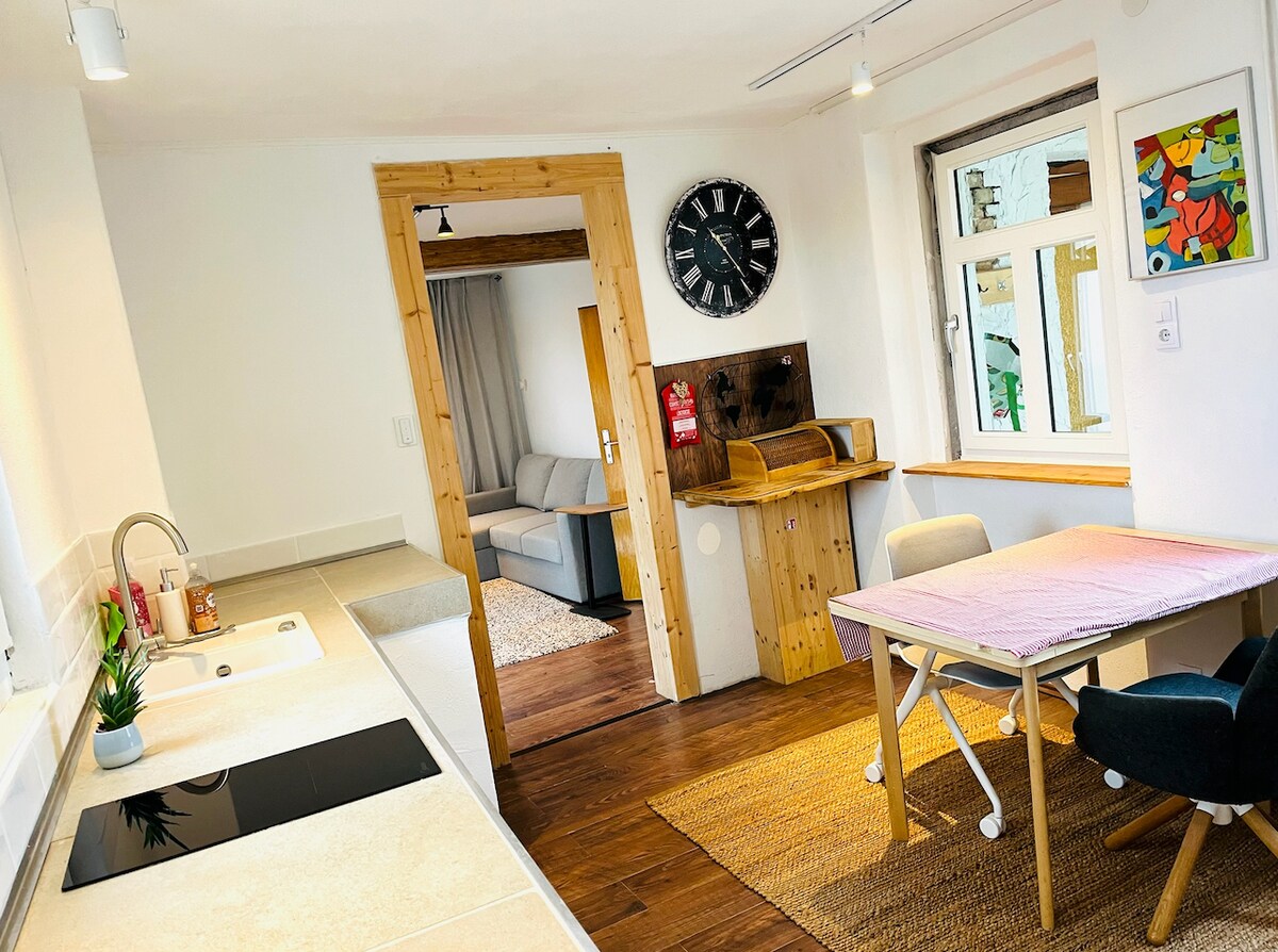 Nuestro apartamento granero con grandes camas de la época de la bisabuela está equipado con una acogedora sala de estar, 2 televisores y wifi. En el dormitorio pueden pernoctar 3 personas, además de 4 huéspedes en la sala de estar. (Cama doble de 2x2 m y sofá cama de 120x200 cm). La cocina invita a cocinar. El baño tiene ducha, inodoro y lavabo. El apartamento tiene su propia entrada. Se vive solo muy tranquilo en el granero justo al lado del jardín. Nuestro Wallbox en el patio proporciona la mayor comodidad para recargar el coche eléctrico.