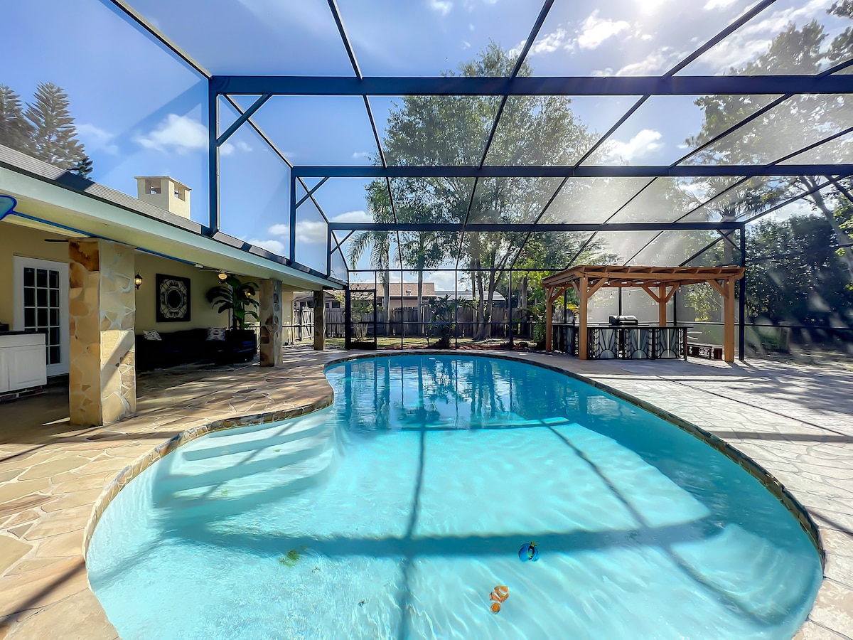 Esta casa de 2 dormitorios y 1,5 baños es privada, limpia y acogedora. La cocina abierta cuenta con electrodomésticos de acero inoxidable y ofrece todos los utensilios de cocina necesarios. El amplio comedor/sala de estar recibe suficiente luz solar a través de las ventanas panorámicas. Disfruta de las hermosas vistas al campo de golf mientras estás sentado en la mesa del comedor y/o en la enorme terraza exterior. Hay un comedor al aire libre y una parrilla en la terraza. La casa está a 45 minutos de los parques temáticos (Disney y Universal) y de las playas (Daytona/New Smyrna).