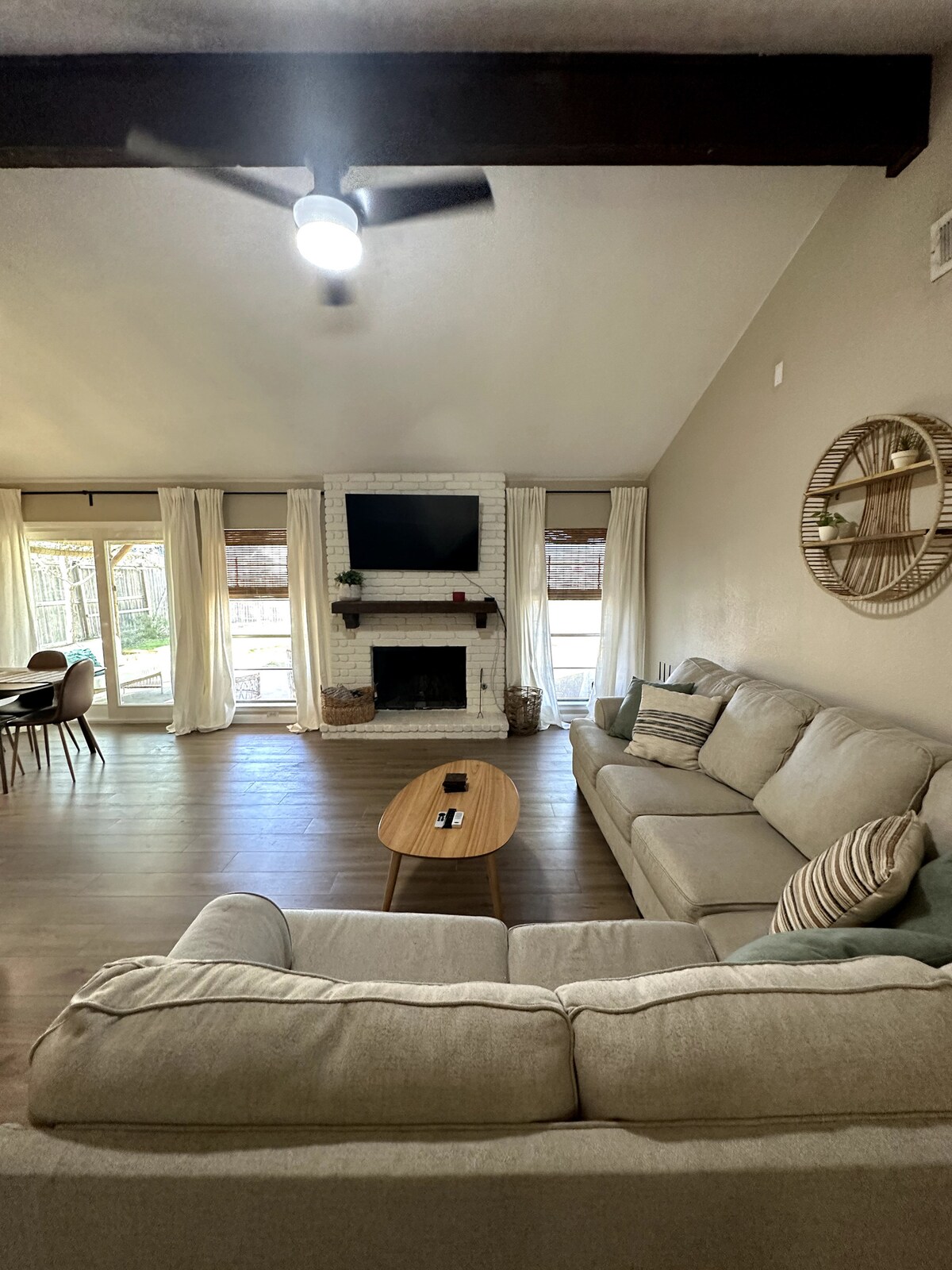 Esta casa de campo de nueva construcción se encuentra a pocos minutos de todo lo que viniste a ver. Ubicado en los suburbios; pero, lo suficientemente cerca de las autopistas norte/sur y este/oeste para hacer todas las atracciones a solo unos minutos de tu puerta. A solo 7 minutos del aeropuerto de San Antonio. Nuestras pintorescas ventanas llevan el exterior directamente a la sala de estar. Y nuestras persianas enrollables controladas a distancia proporcionan total privacidad.