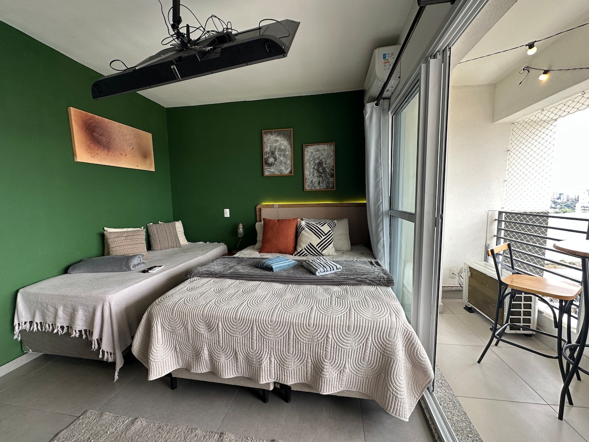 Estudio boutique con una de las vistas más bonitas de la ciudad de São Paulo. A 2 minutos a pie del metro. Cocina totalmente equipada con nevera escondida por una puerta de madera. Wifi, aire acondicionado y TV inteligente de 55 pulgadas. Registro autónomo con cerradura electrónica inteligente. Juega al tenis o ve al gimnasio y relájate en las piscinas (al aire libre o cubiertas climatizadas) y saunas (húmedas o secas) después. El área común también incluye espacios de coworking y lavandería. Los visitantes deben estar previamente registrados en la recepción.