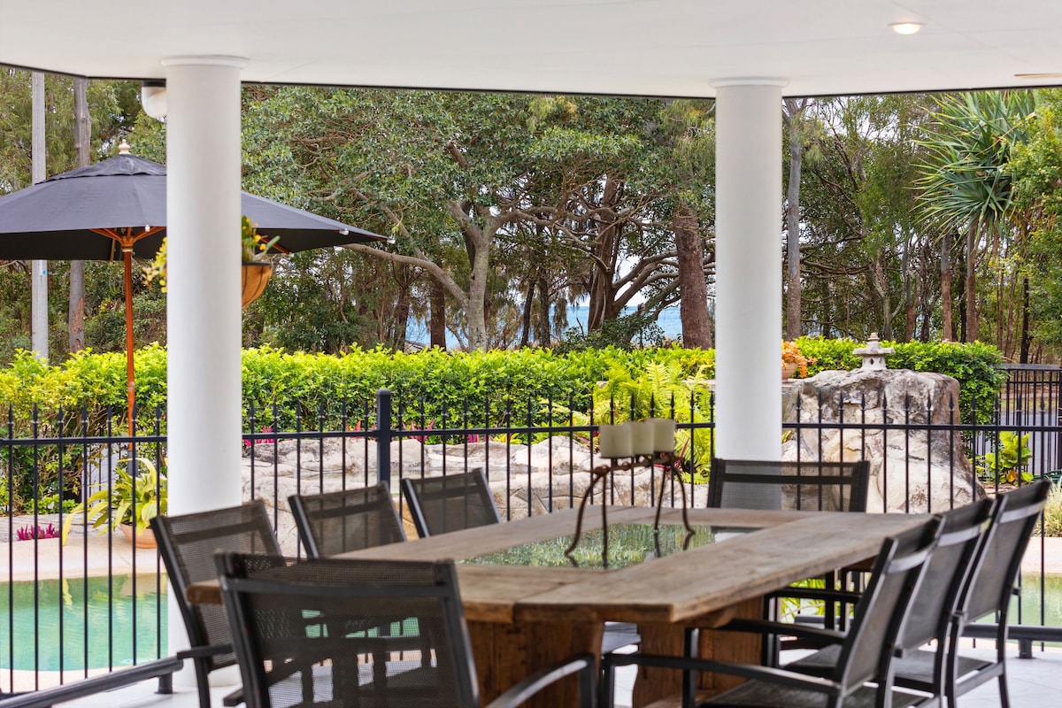 Nuestra casa redonda se encuentra en una superficie costera rural, en el borde del Gran Estrecho de Arena con vistas a la isla Fraser y las gloriosas aguas azules de esta zona. Recientemente renovada y muy cómoda, ofrecemos tres dormitorios: el dormitorio principal con cama tamaño queen está arriba y tiene aire acondicionado, TV y un baño privado, mientras que abajo está el dormitorio con cama tamaño queen y el dormitorio con dos camas individuales, con el baño compartido. También hay un aseo independiente arriba. Otras áreas para disfrutar son el salón, el comedor, la barbacoa, el rincón de lectura y la terraza.