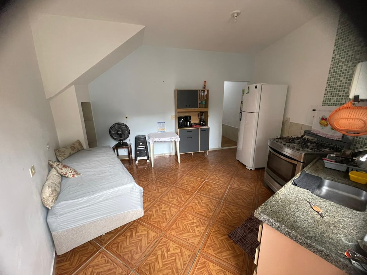Casinha muy cerca de la playa con dormitorio/ baño y pequeña cocina con: mesa y utensilios de cocina. Wi-Fi -Varal-Tanque - TV inteligente Voltaje 220 toda la casa, excepto el enchufe de la estufa ( 110w). Patio compartido con dos suites de alquiler más. Cerca de supermercados, Unaerp, panaderías y farmacias (5 min a pie). Orla da Praia (a 10 minutos a pie). Llegada a las 12:00 p. m., 12:00 p. m. Salida a las 10:00 a. m. Ambiente familiar.