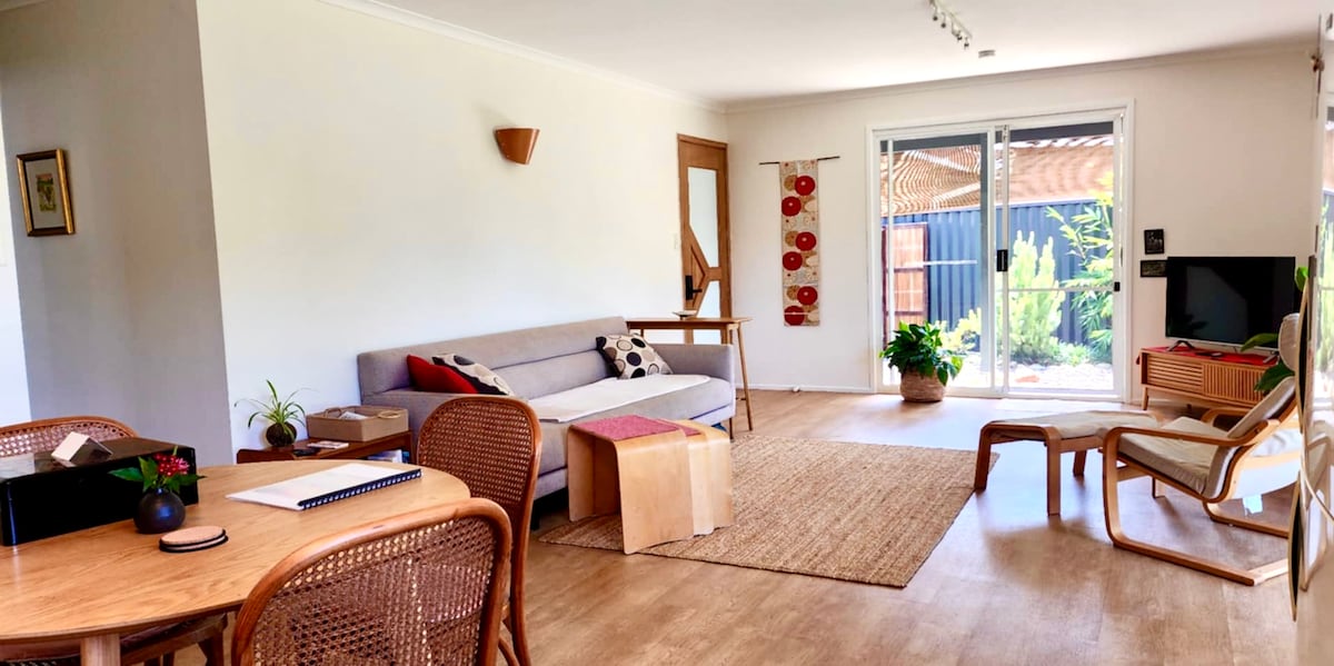 Ven a nuestro pedazo de paraíso y tómate un tiempo en la moderna casa de campo de un solo nivel construida a finales de 2020, en 4,5 acres con vistas a los llanos del río y un lago de agua dulce. Tranquila y abierta, con fácil acceso en todas partes. La sala de estar da a una gran terraza cubierta con vistas al río, el lago y las llanuras cubiertas de hierba para mirar y disfrutar. Cocina moderna totalmente equipada. 2 dormitorios con camas tamaño queen de lujo y ropa de cama incluida. Hay un sofá cama en la sala de estar, TV inteligente, Netflix/Stan y wifi gratuito.