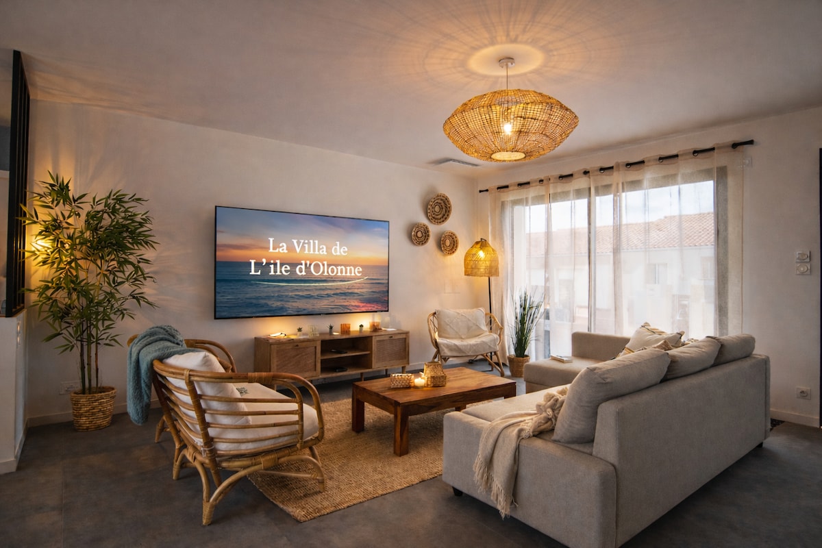 Séjournez dans une maison en bois neuve (aout 2019) à deux pas de la plage, de la forêt et des marais salants. Située à proximité des Sables d'Olonne (5 min en voiture), profitez du jardin au calme. Pistes cyclables toutes proches de la maison direct vers la plage, foret et marais. La maison dispose de 3 chambres : 1 chambre parentale (lit queen size) et 2 chambres plus petites dont les lits sont modulables en lits simples séparés ou en lit queen size. Plafond rampant dans les chambres.