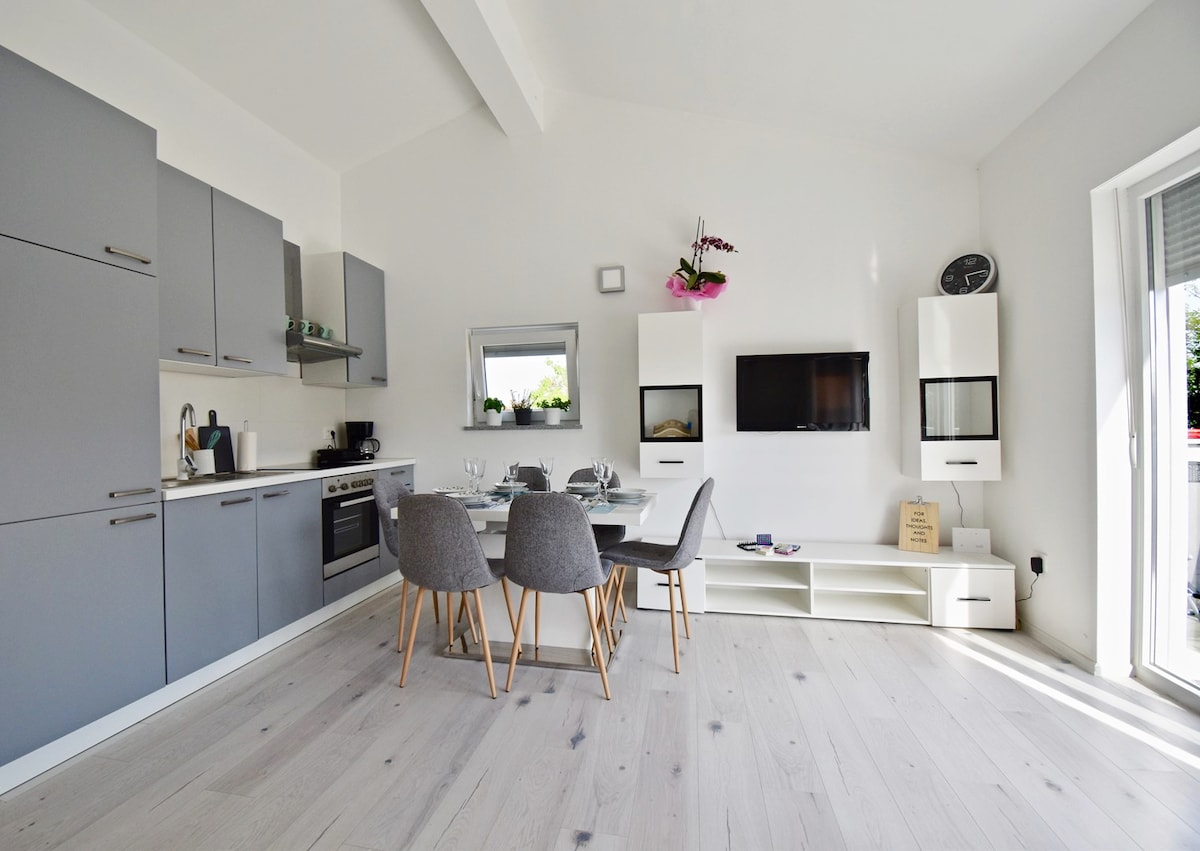 El espacio está climatizado (dos aires acondicionados, uno en el comedor y otro en el dormitorio principal) y el aire acondicionado no se cobra por separado. Los huéspedes tienen acceso a Wi-Fi gratuito. Los huéspedes también tienen a su disposición 2 - 4 plazas de aparcamiento en el patio. El edificio se completó en 2017 y todo es completamente nuevo (baño, cocina, habitaciones...). El amplio dormitorio principal se extiende por toda la planta superior del edificio. Los huéspedes tienen a su disposición una parrilla al aire libre y un balcón dentro del apartamento.