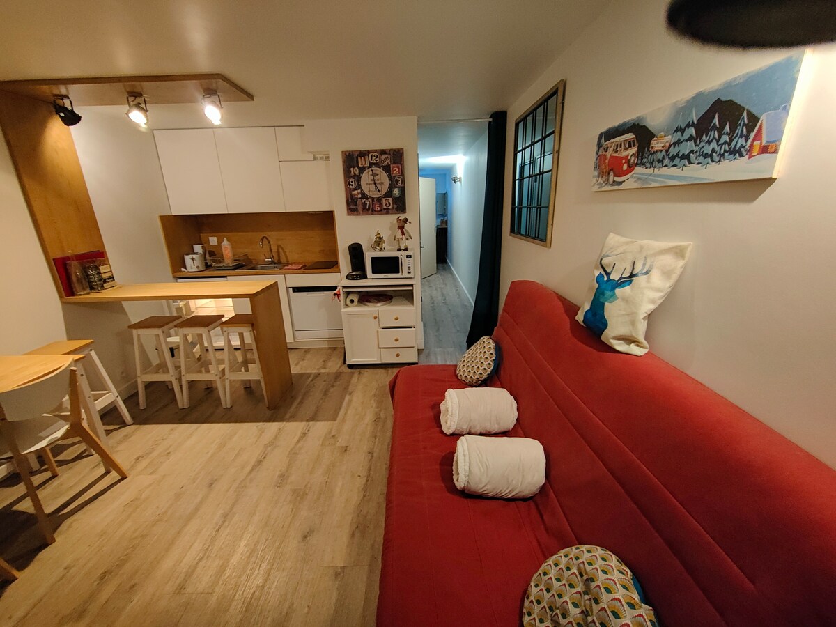 Bonito y acogedor apartamento de 36 m2 justo enfrente del mercado de Luchon. A poca distancia a pie de la telecabina de esquí y del vibrante centro repleto de restaurantes. Patio muy privado para disfrutar del café por la mañana, de una bebida por la noche o simplemente relajarte en la hamaca. Se proporcionan sábanas y toallas de calidad incluidas en el precio. ¡Descuentos para estancias largas! 7 días -15 % 1 mes -30%