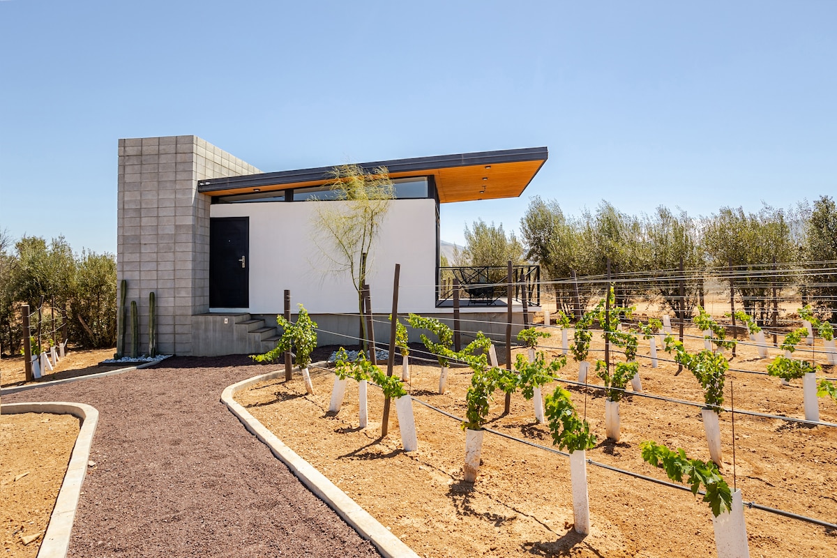 Habitación diseñada para un descanso placentero y disfrutar de amaneceres, atardeceres, el cielo, estrellas y la luna desde su terraza. Para dos personas, con cama Queen, aire acondicionado, ventilador, cafetera, agua caliente e internet satelital de alta velocidad. Barda perimetral para privacidad y seguridad. El baño tiene espejo, jabón, shampoo, acondicionador, toalla de mano y secadora de pelo. Disfruta viñedos y vinícolas en Valle . Seguro y cerca de lugares emblemáticos de la región.