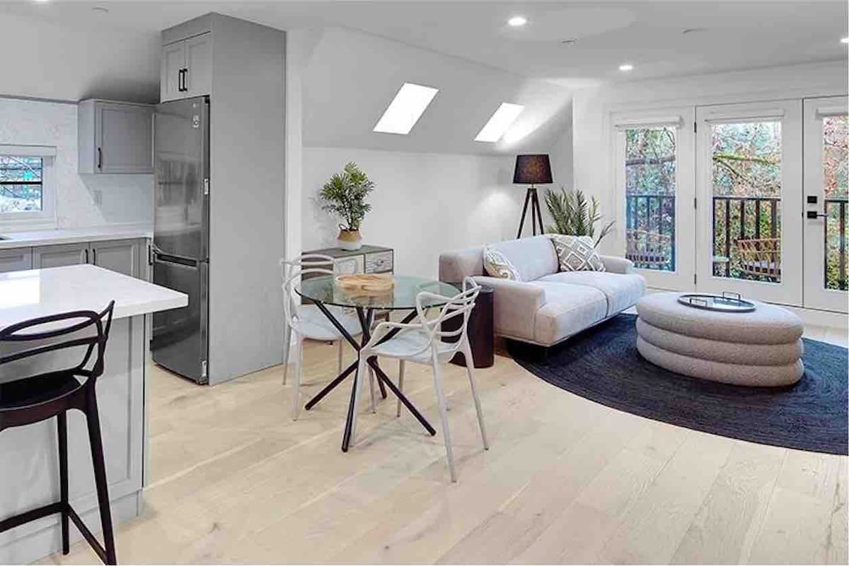 La comodidad moderna y el encanto acogedor te esperan en esta casa de huéspedes loft. Con una acogedora chimenea de gas estilo cabaña y una cama tamaño king, es el espacio ideal para relajarse después de un día de exploración. Esta casa independiente cuenta con cocina completa, patio privado y baño moderno con bañera. Ubicado justo al lado de la vibrante Commercial Drive, estás a solo unos pasos de los mejores restaurantes, bares y tiendas boutique de Vancouver. Y Skytrain está a solo 7 minutos a pie. Donde el estilo moderno se une a la calidez acogedora, ¡estamos deseando recibirte!