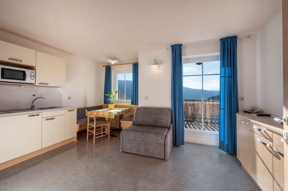 Sunny apartment with terrace and green area on the ground floor. Perfect location immediately next to the ski slope ,,Brunnerlift’’ and connection to the skiing area Gitschberg-Jochtal. Stunning view on the mountains of the Dolomites, Val Isarco and Val Pusteria and an optimal starting point for hiking and walking. Price for 2 people/day; for every additional person there will be an extra charge. The tourist tax (2.10 euros/person <14 years/night) will be collected upon arrival.