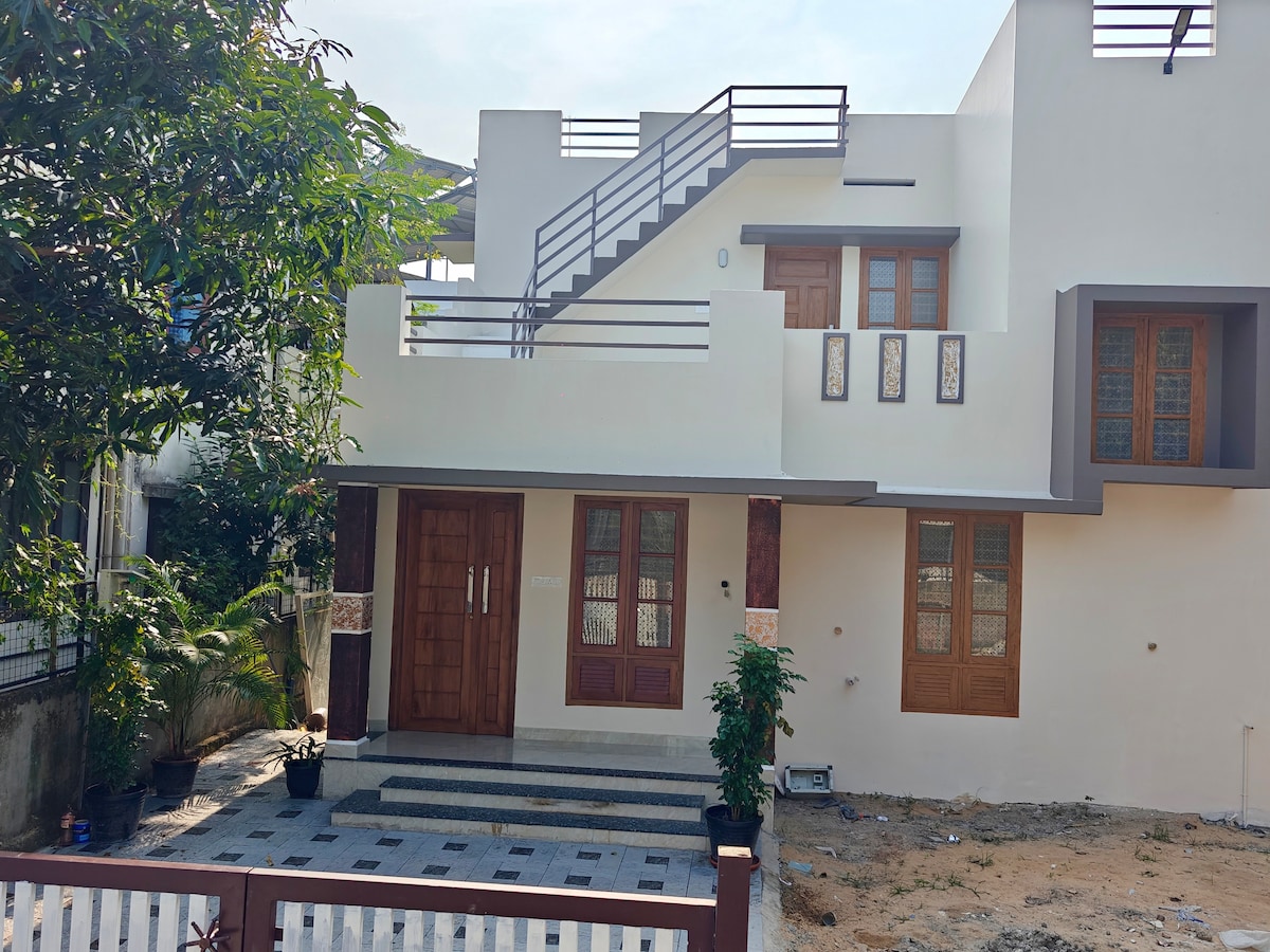 Alójate en un encantador 1BHK de estilo Kerala a pocos minutos de la playa de Varkala. Perfecto para parejas o familias pequeñas, este acogedor alojamiento ofrece privacidad, comodidad y un toque de tradición. Disfruta de un dormitorio espacioso, sala de estar y tu propia cocina para cocinar comidas frescas. Rodeado de vegetación, es tranquilo pero está cerca de la playa, cafeterías y tiendas. Ideal para aquellos que desean una escapada relajada junto a la playa con las comodidades de casa.