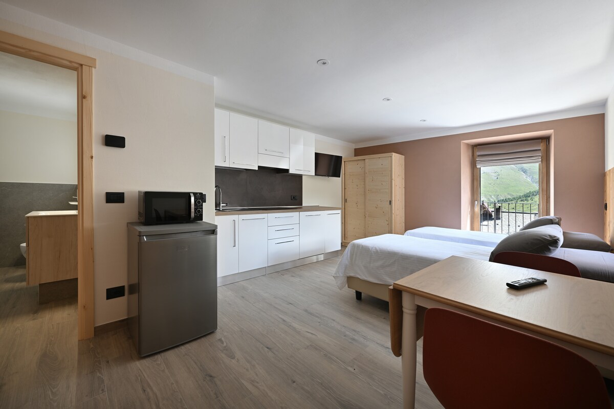 Unsere Einzimmer-Studios sind für max. 2 Personen mit Doppelbett (auf Wusch auch mit 2 Einzelbetten) komfortabel eingerichtet; sie verfügen über eine vollständig eingerichtete Kochnische. Badezimmer mit Dusche oder Badewanne. Flachbildschirm. Südbalkon oder Gartensitzplatz mit Balkoneinrichtung. !!Buchen Sie unser Panorama Studio und geniessen ab 2. Etage eine herrliche Aussicht und noch mehr Sonne!!