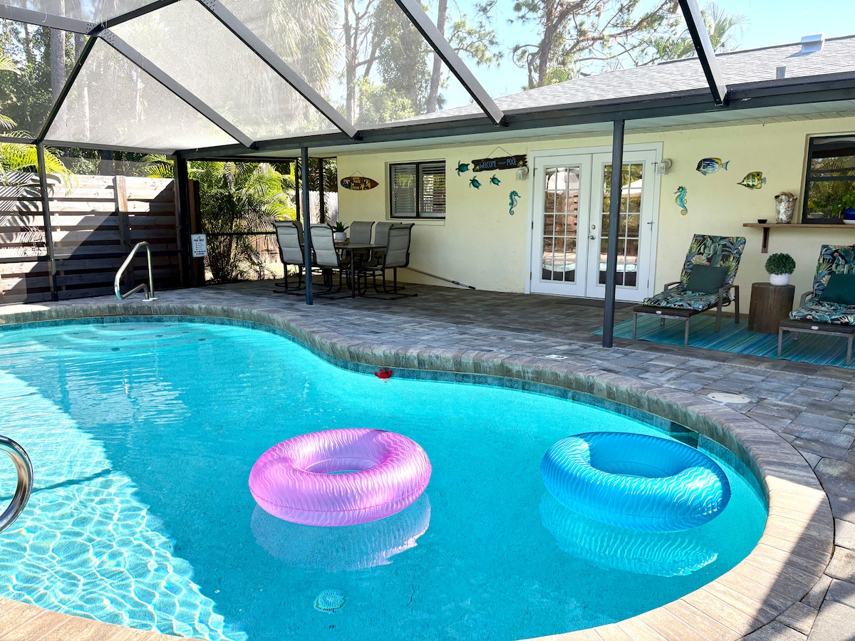 Relaxing pool home with new AC , 2 bedrooms, 1 king bed, 1 queen bed, 1 sofa double bed and one single foldout bed. 2 bathroom pool home just a 8 minute ride away from Manasota beach. Venice beach and caspersons beaches close by too. A great selection of restaurants and plenty of shopping and convenient grocery stores just 5 minutes away!. Also close to bike trails with two FREE bikes at the house and FREE kayaks too. My home is great for everyone! Pets welcome with pet fee, large fenced yard!