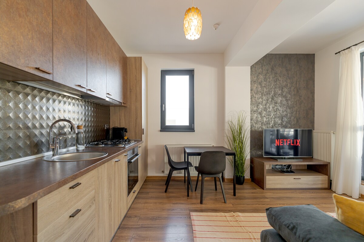 Luminoso y espacioso apartamento tipo estudio ubicado en un edificio de 10 plantas, recién reformado con una cocina moderna totalmente equipada con placa eléctrica, nevera integrada y frigorífico, y todos los demás utensilios de cocina necesarios para preparar una comida gourmet. Se encuentra en una zona estupenda con un barrio tranquilo, a menos de 15 minutos del centro de la ciudad, con transporte público directo al casco antiguo, cerca de una gran variedad de hermosos parques y lagos como Tei, Plumbuita, Circului. Aparcamiento gratuito disponible.