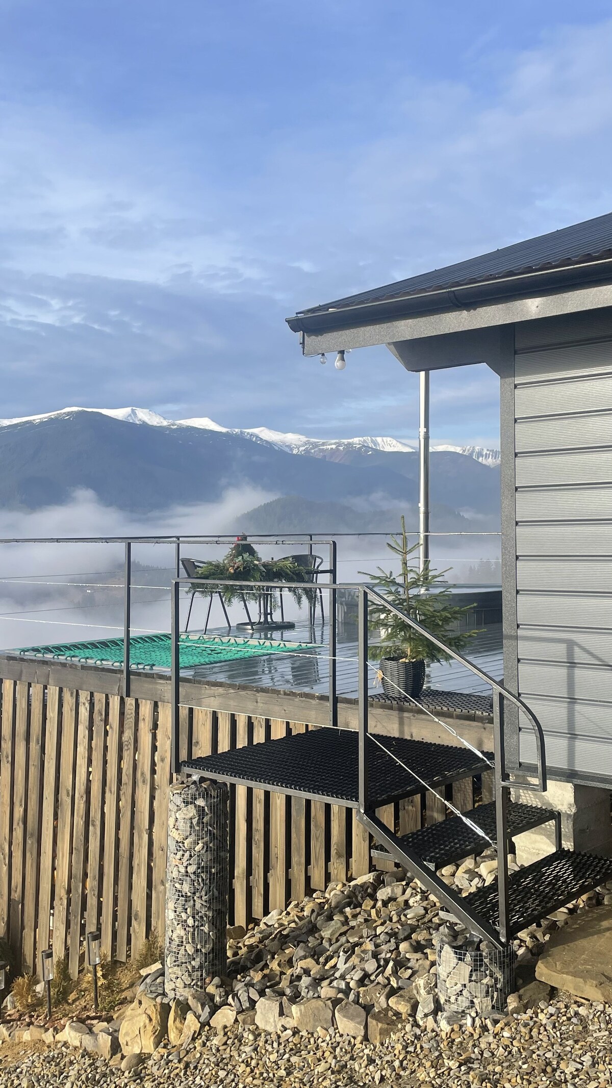 Riverside mountain home for 6–8 guests, ideal for families & friends to reconnect. Enjoy panoramic mountain views from every patio, gather at the large dining table, and relax by the fire pit under the stars. Modern design combined with authentic Hutsul style, high ceilings, strong Wi-Fi, and a calm nature setting. Located 1 km from the main road, with hiking trails and cultural sites nearby. A peaceful, nature-filled getaway.