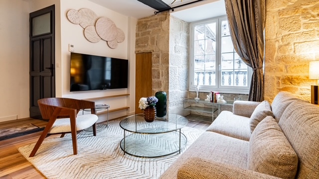 El apartamento con una superficie de 35 m2, se encuentra bajo los tejados de una casa del siglo XVI clasificada como Monumento Histórico. Está idealmente situado en pleno centro histórico de Dijon, en el barrio de los Anticuarios, a dos pasos del Palacio de Duques y del Museo de Bellas Artes. Ha sido completamente renovado en un espíritu auténtico y cálido con todas las comodidades modernas.
